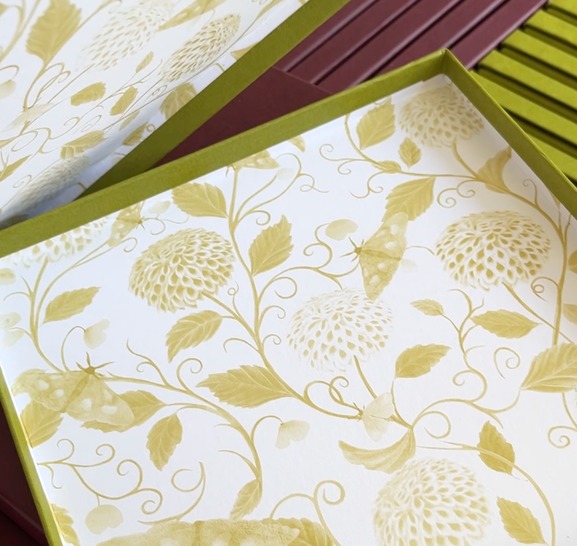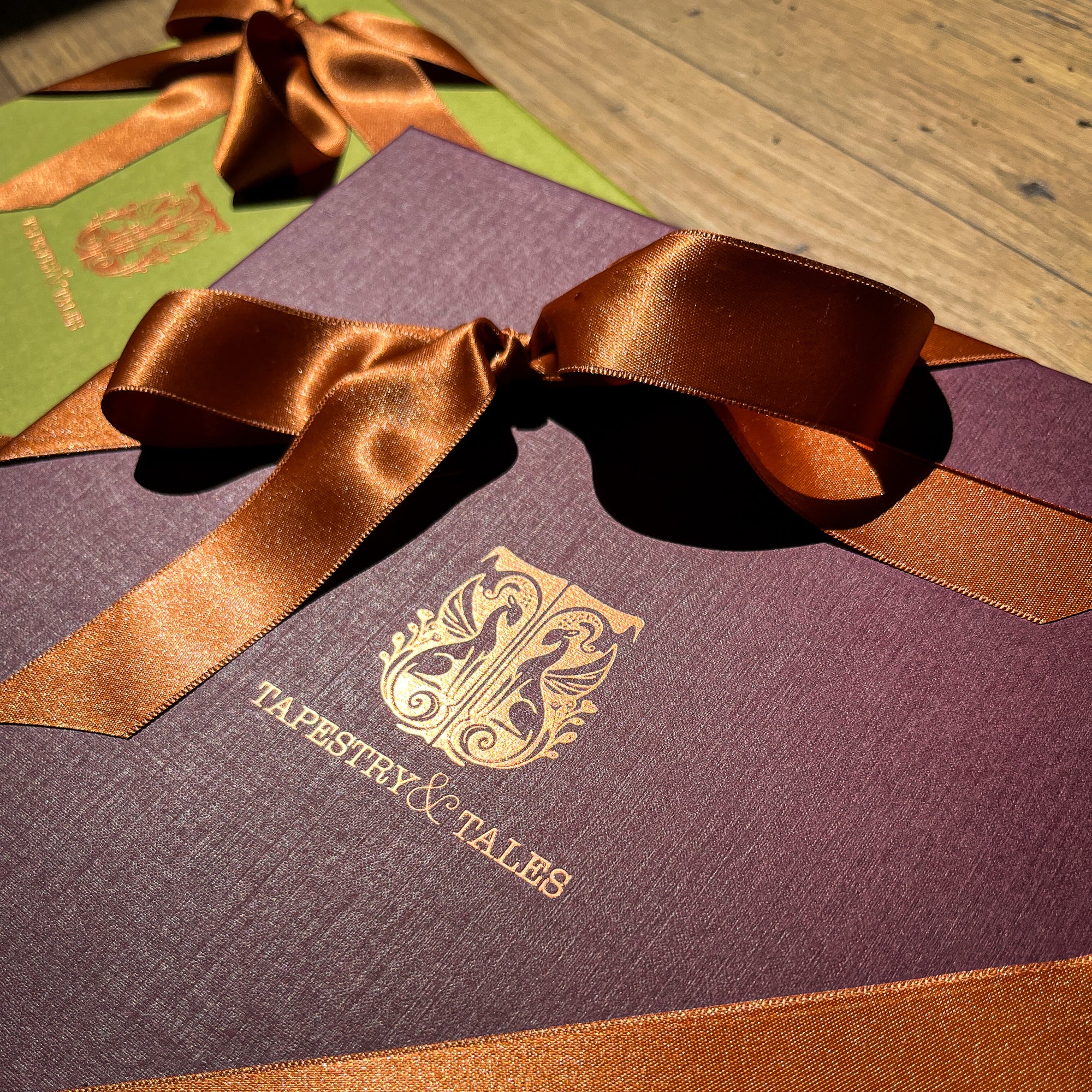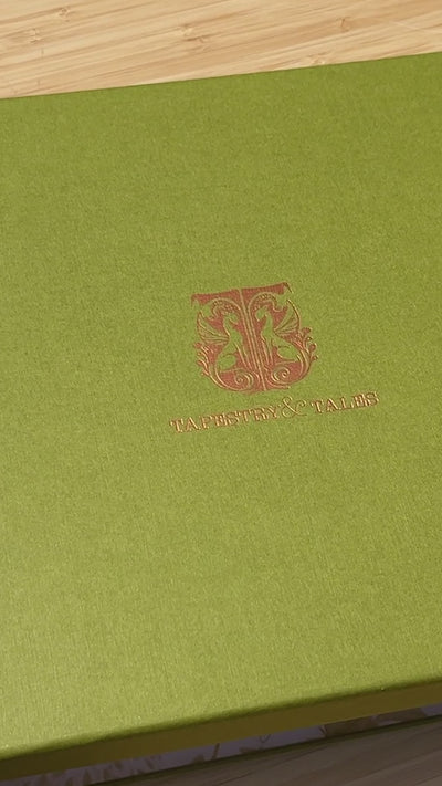Every Tapestry & Tales scarf is presented in a linen-covered box handmade in England. The interior is lined with a hand-illustrated print that reflects the same artistry and attention to detail found in each design.